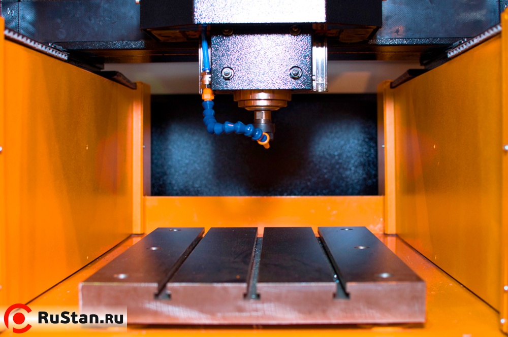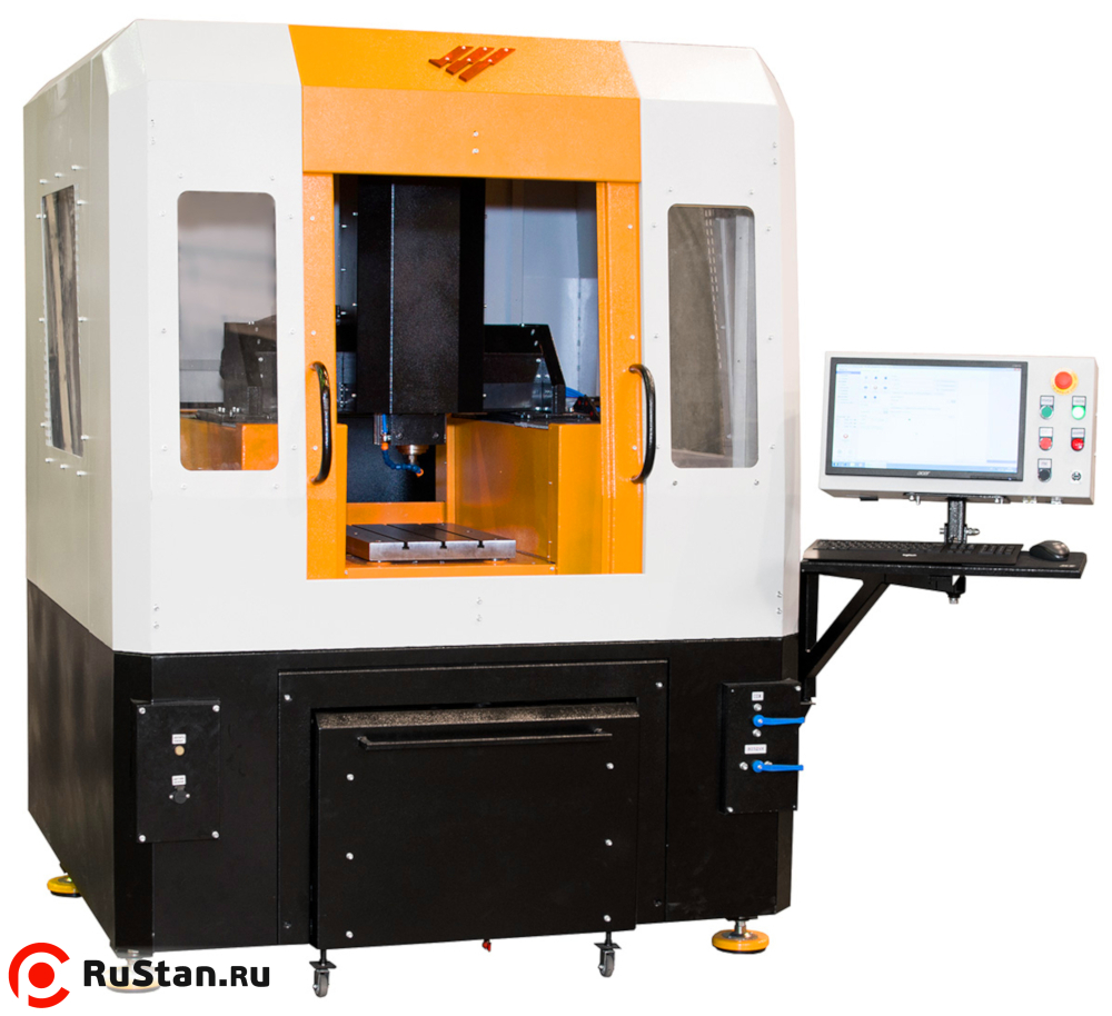 Станок портальной конструкции с подвижным порталом. При этом направляющие закреплены горизонтально, то есть параллельно плоскости рабочего стола, что обеспечивает значительно большую жесткость конструкции по сравнению со схемой вертикального расположения направляющих.