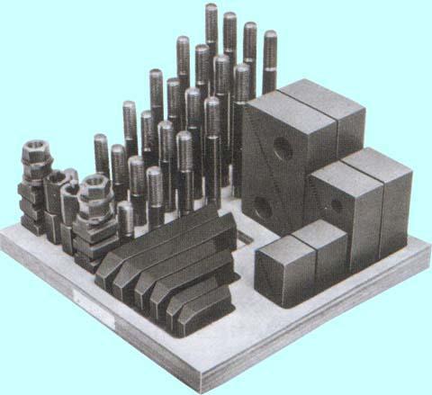 Набор предназначен для фиксации заготовок, деталей сложной формы при дальнейшей обработке на фрезерных, сверлильных и других станках , имеющих ширину паза 11.7-12 мм на столе. Для удобства работы набор располагается на открытой деревянной подставке.