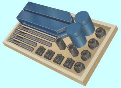 Набор предназначен для фиксации заготовок, деталей сложной формы при дальнейшей обработке на фрезерных, сверлильных и других станках , имеющих ширину паза 13.7-14мм на столе.