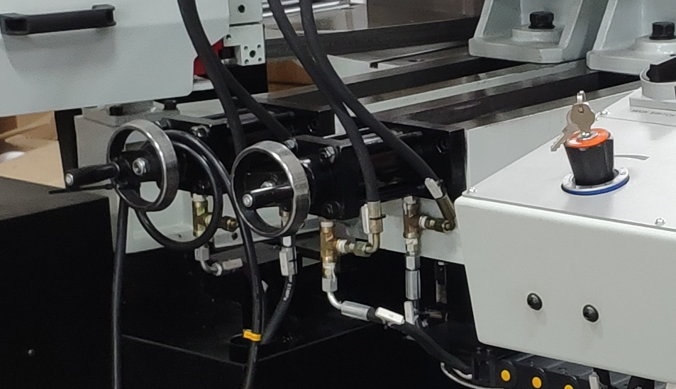 Станок оснащен гидравлическими тисками с возможностью быстрого зажима заготовок. Помимо гидравлического зажатия, тиски имеют механический ход. На основной панели расположены: цветной сенсорный дисплей, с помощью которого можно задать программу и отслеживать процесс пиления, регулятор скорости опускания пилы и кнопка аварийного останова.