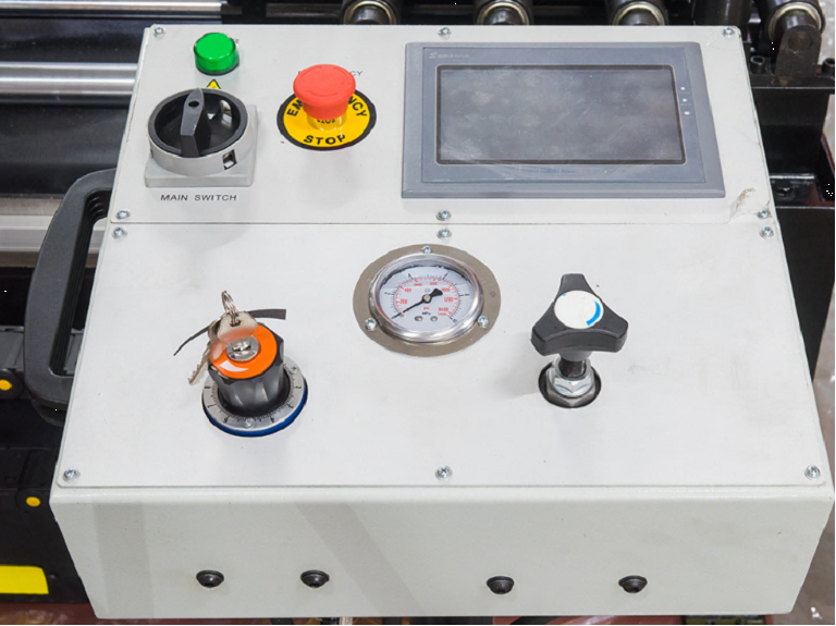 - Станок оснащён серводвигателем для плавной регулировки скорости вращения полотна 0-100 м/мин